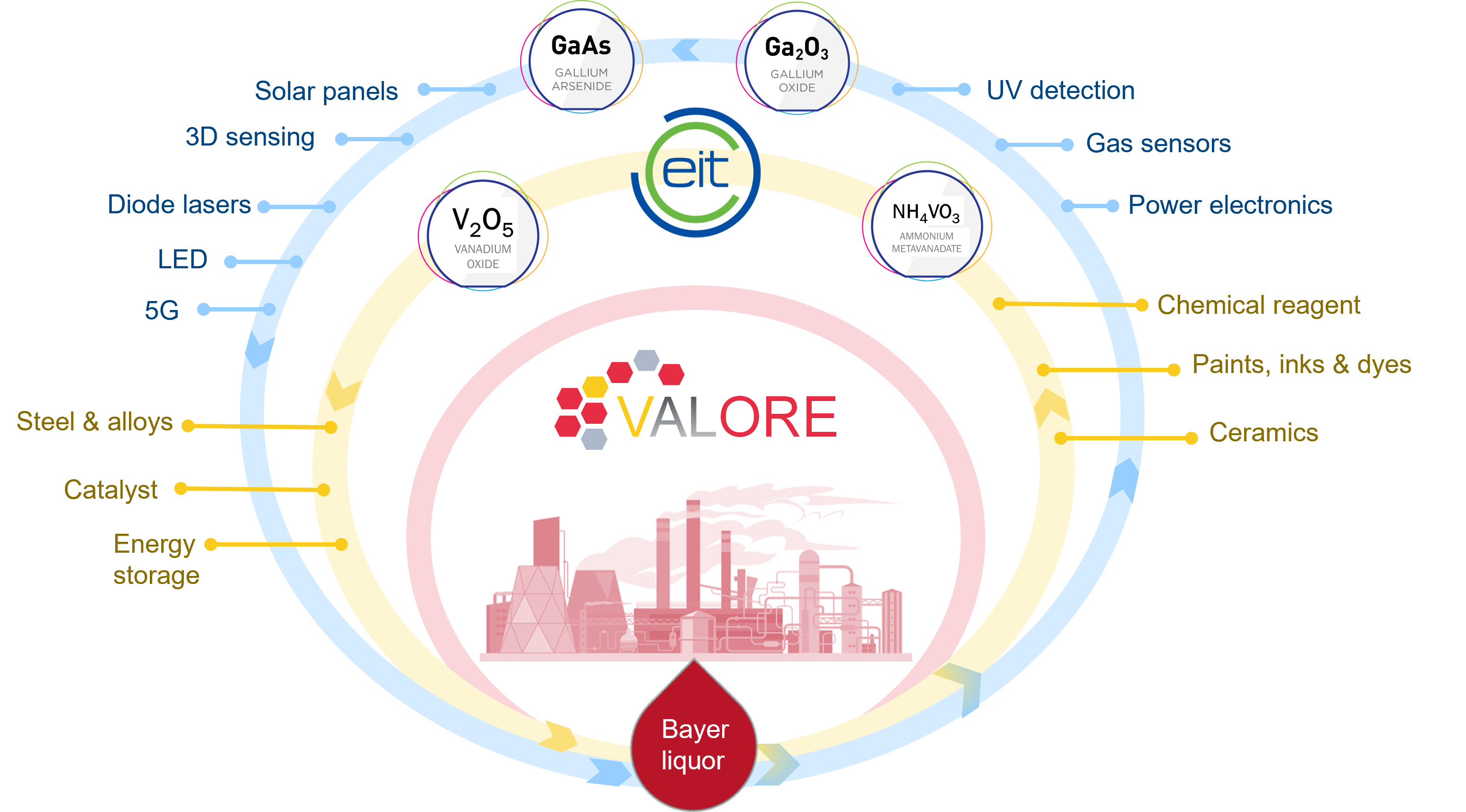 VALORE will upscale a novel process for the recovery of vanadium (V) and gallium (Ga) as by-products from an alumina refinery. Bayer Liquor from the aluminium industry is the main source for the production of Ga today. Even though, the Bayer liquor can also contain high concentrations of V, it is not yet recovered as by-product. Moreover, the presence of V in the liquor hampers the recovery of Ga since current technologies co-extract V and Ga simultaneously making it challenging to refine the Ga and V mixture.